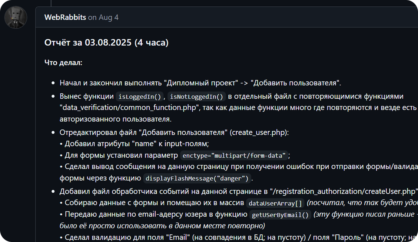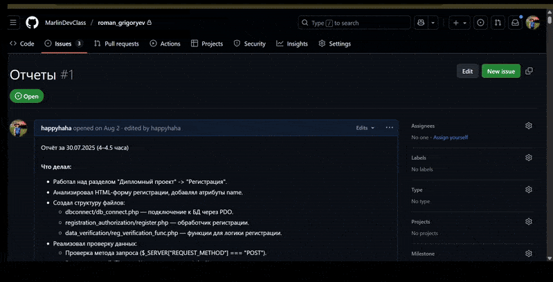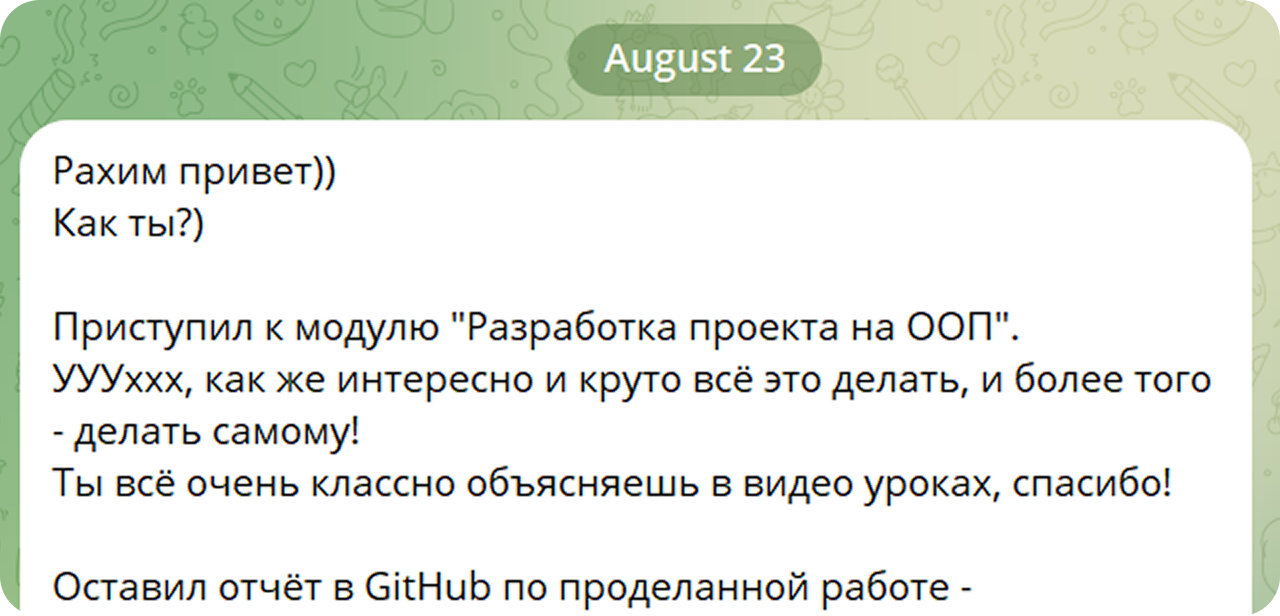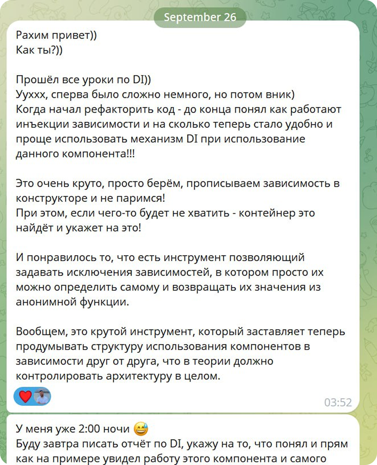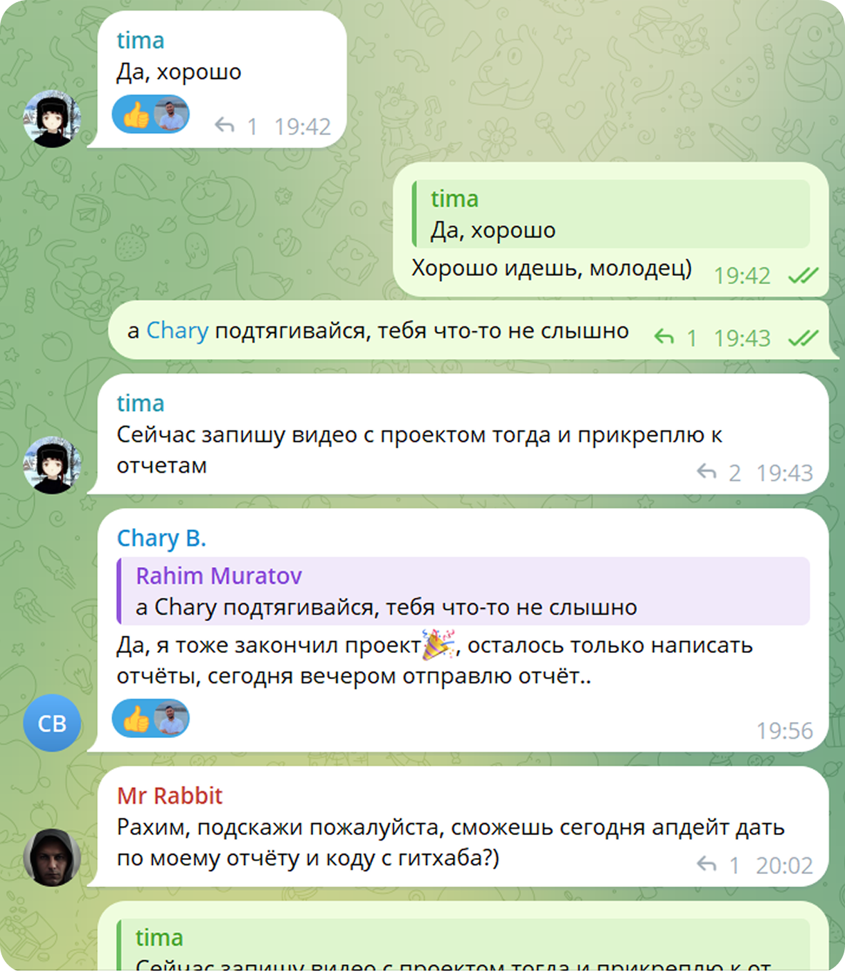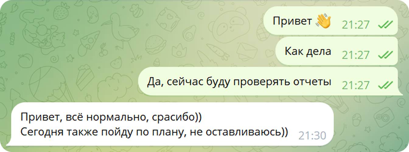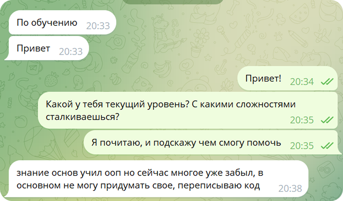 Чтобы компенсировать это, я внедрил систему отчетов. После каждого занятия ученик пишет, что изучал, что пробовал, что получилось и где было трудно. Так я вижу не только результат, но и сам процесс — как человек понимает материал и где сомневается.