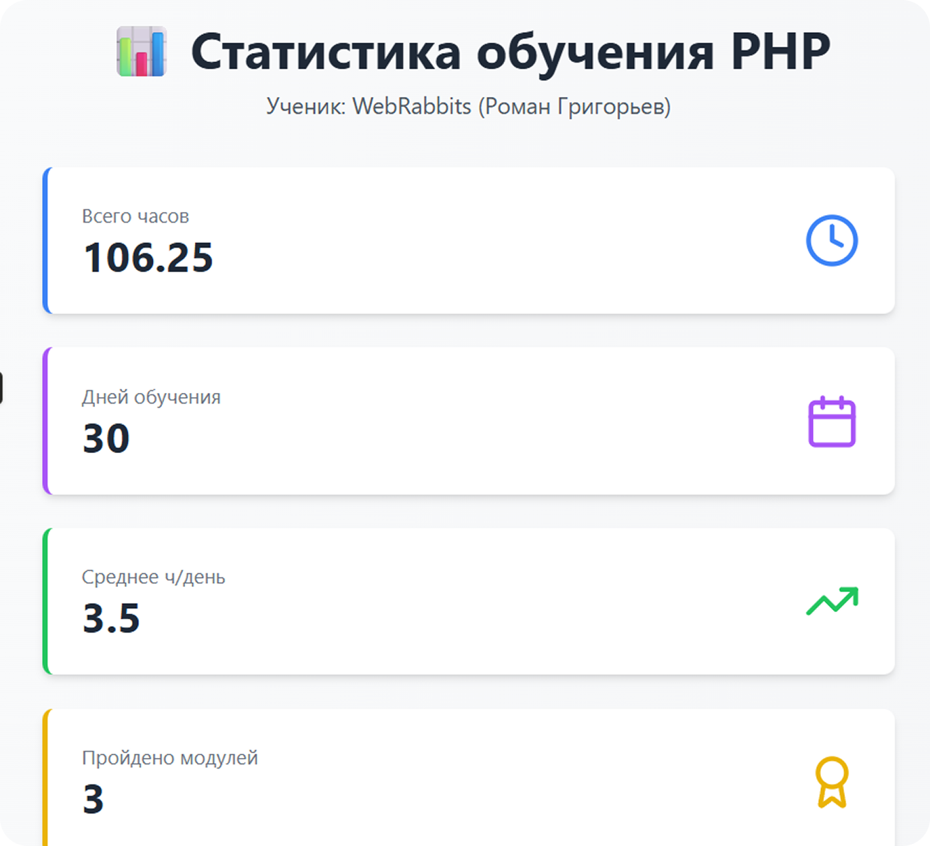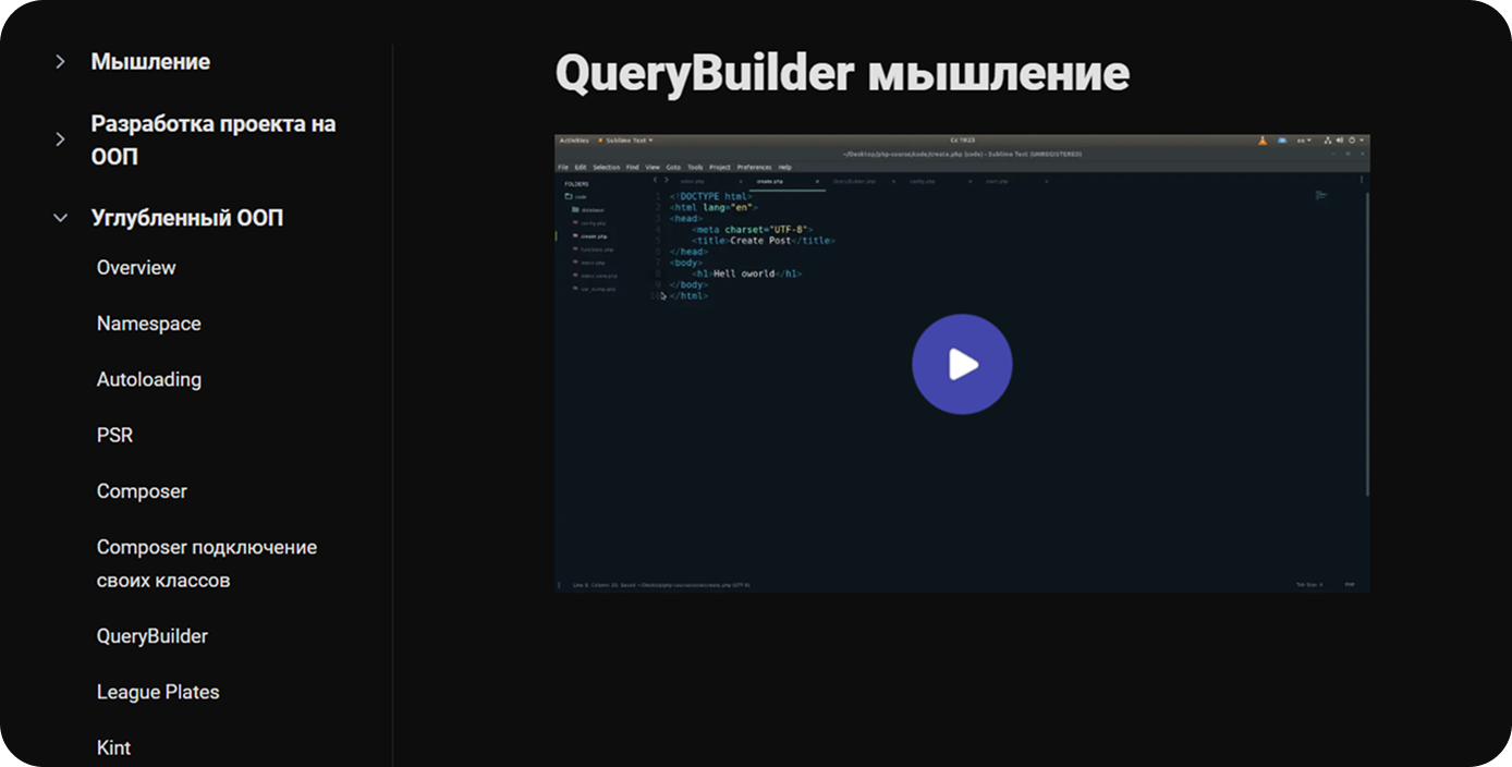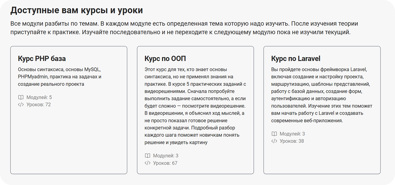 За три месяца участник проходит путь от простых задач на чистом PHP до самостоятельной разработки проекта с использованием ООП и фреймворка Laravel.