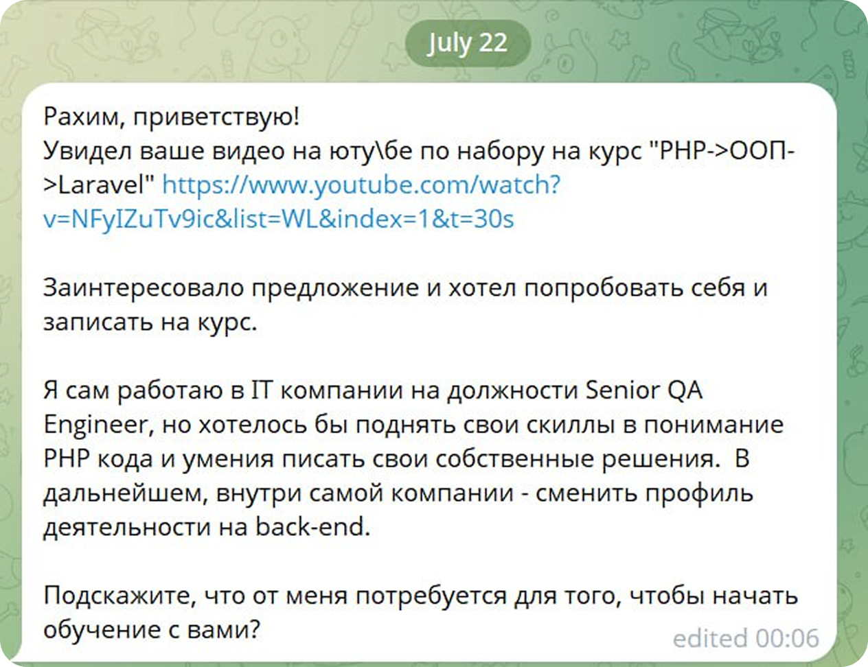 Если вы ещё не знакомы с PHP или HTML — приходить пока рано. А если вы уже уверенно работаете с ООП, фреймворками, понимаете паттерны и вам легко учиться самому — мое обучение вам не нужно.