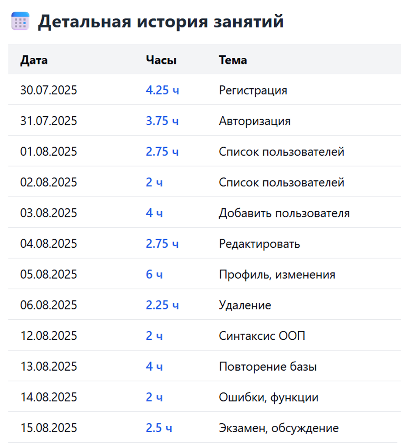 В итоге, все отчеты отображают весь путь ученика, и превращаются в подробный дневник обучения: