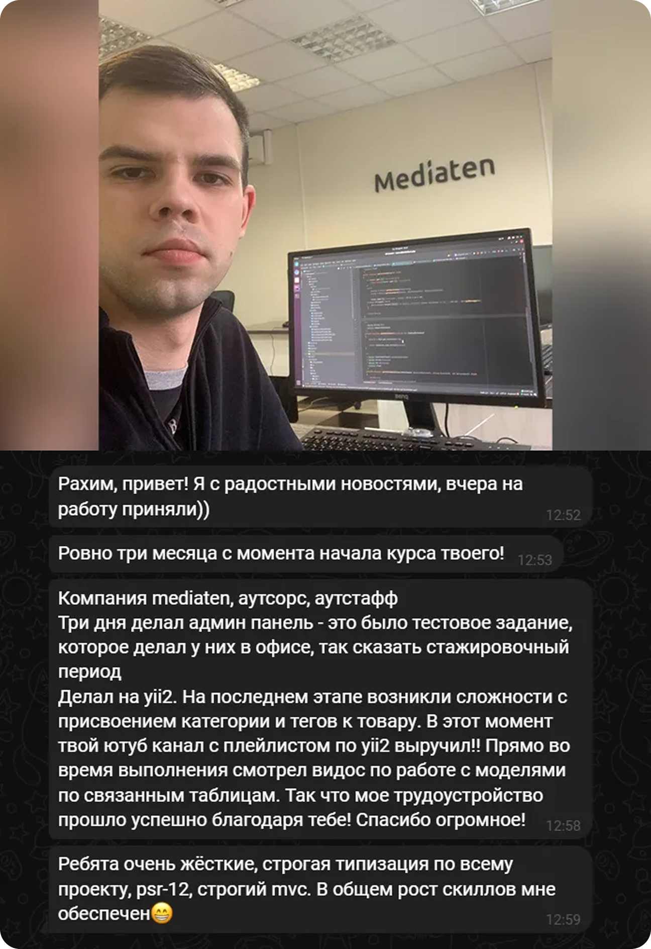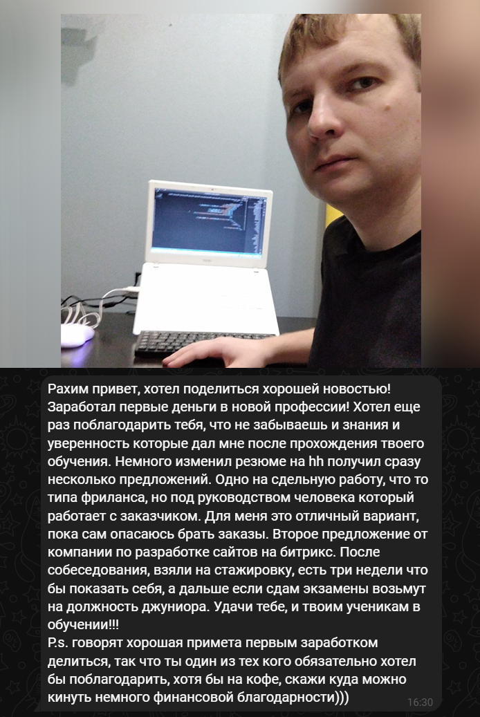 Но это не значит, что через три месяца вы сразу получите предложение о работе. Результат всегда индивидуален и зависит от многих факторов. Один из них — хорошее обучение. Если вы понимаете это и ищете именно такое обучение, то вам ко мне.