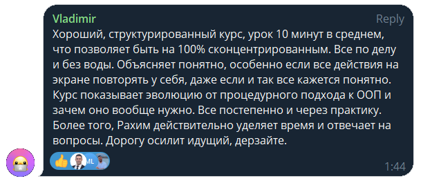 Формат построен вокруг практики: ученик получает задачи, пишет код, сдаёт отчёты и получает подробную обратную связь. Наставник объясняет логику решений, помогает разобраться в архитектуре и корректирует мышление.